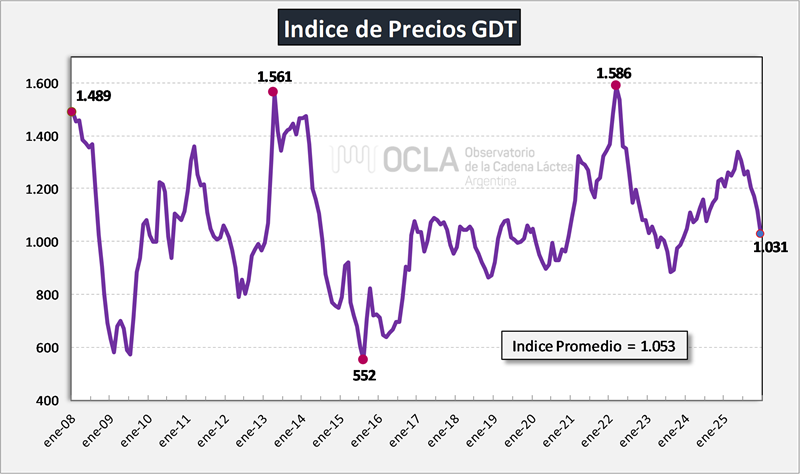 Cabe acotar que los precios de FAO promedian varias commodities de dos mercados muy representativos. Por su parte el Índice del GDT de Nueva Zelanda presentó mejoras de precios a partir de septiembre 2023 con algunos altibajos, pero continuando una significativa tendencia positiva que llega a su máximo en mayo de 2025 y luego comienza a caer con una leve recuperación en agosto próximo pasado, nueva caída en septiembre-diciembre y precios futuros a la baja.