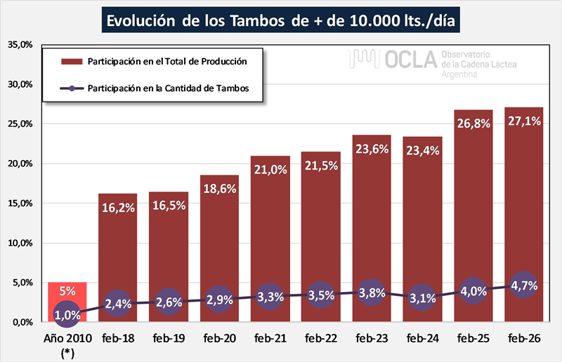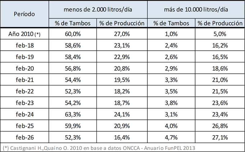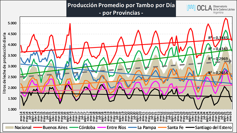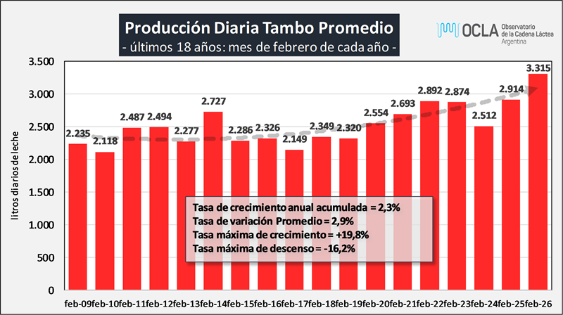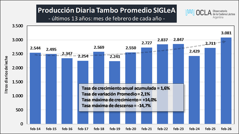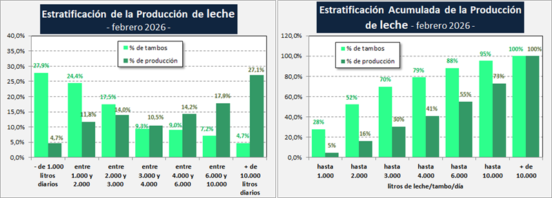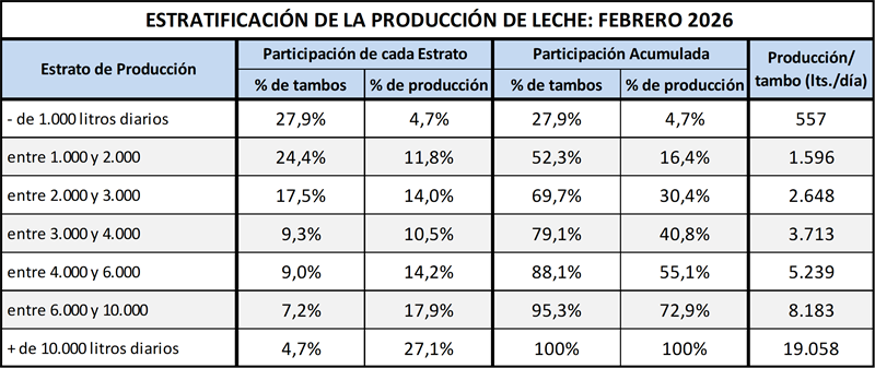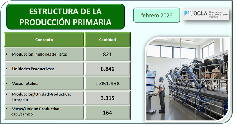 En el mes de febrero del 2026 la producción fue de 821millones de litros de leche, esto implica un valor 15,0% por debajo del mes anterior (-5,9% en el promedio diario), un 10,6% más que igual mes del año anterior.
