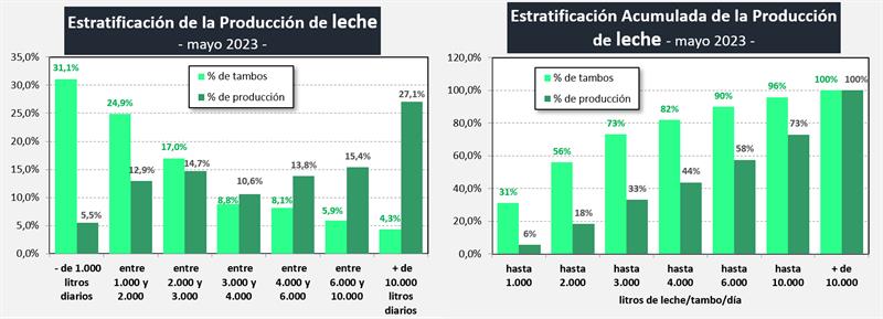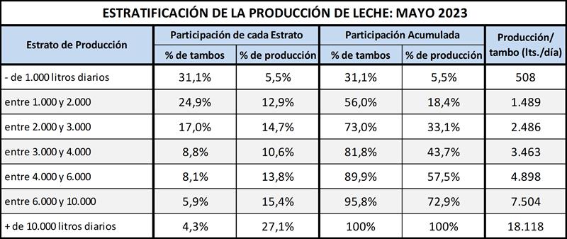 Puede verse en los meses de mayo de los últimos cinco años (2019-2023), y también comparado con datos disponibles del año 2010, que en un extremo disminuye la participación tanto en cantidad de tambos como en el volumen de producción de las unidades productivas de menos de 2.000 litros diarios y en el otro extremo de la estratificación, se incrementa la participación de las unidades de más de 10.000 litros diarios.