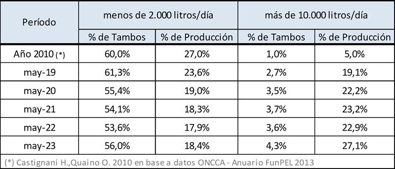 Entre 2023 y 2010 los tambos de menos de 2.000 litros de producción diaria redujeron un 32% su importancia relativa en la producción de leche total y los tambos de más de 10.000 litros diarios de producción, multiplican por más de 5 su participación en la producción.