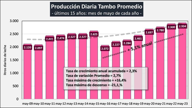 Sobre la base de la producción mensual y la cantidad anual de tambos (SENASA), podemos inferir el tamaño del tambo promedio, unos 2.934 litros de leche diarios para mayo de 2023, un 1,2% más que el año anterior. Si evaluamos su comportamiento en el tiempo, a pesar de la disminución en el número de unidades productivas y en el número de vacas, el tambo promedio presenta en el período 2009-2023 una tasa de crecimiento acumulada anual del 2,3%, lo que permite el sostenimiento e incluso aumento de los niveles productivos agregados a nivel país.