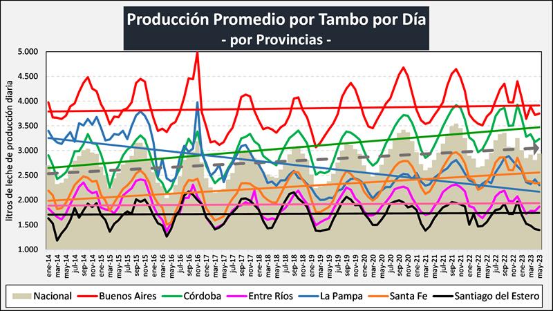 Por último, en el gráfico de abajo se muestra la tendencia en la evolución del tambo promedio nacional y por provincia, donde hay provincias como Córdoba con una importante tendencia al crecimiento (mayo R cuadrado), en la producción de sus unidades productivas, seguida por Santa Fe y luego el resto con una tendencia estable y un solo caso negativa.