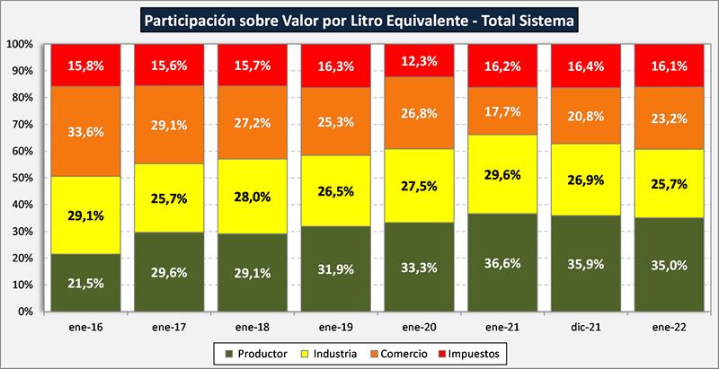 La participación del productor en el total del sistema fue para enero de 2022 del 35,0%, -0,9 puntos por debajo del mes anterior, bastante por encima de la media del 31,3%. Una baja en la participación en los valores finales de mercado interno (0,9 puntos porcentuales) y también una reducción de 1,5 puntos porcentuales en la participación de los valores de mercado externo, colocándola por debajo de la media histórica de la serie disponible (64,3%). La participación del productor sobre el valor de salida de fábrica (precio al que vende la industria) fue de 57,7%, 0,5 puntos superior que el mes pasado y 4,8 puntos encima del promedio de la serie (52,9%). Cabe recordar que la serie histórica para los valores de salida de fábrica tiene una mayor extensión temporal que el resto.
