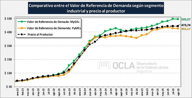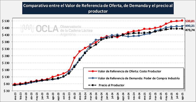 En el mes de agosto de 2025 la capacidad de pago según IAPUCo llegó a $ 490,31/litro de leche (inferior al mes anterior) y fue $ 16,57/litro, superior al precio real pagado que fue para ese mes de $ 473,74. No se incluyen Notas de Crédito, ni los pagos por fuera de la liquidación formal que también son precio y obviamente las estadísticas no pueden capturar. También se puede observar en el gráfico superior que el Valor de Referencia de Demanda o Costo de Largo Plazo del Productor estuvo en agosto 2025 en $ 530,81 ($ 57,07 por encima del precio percibido) y que la brecha que se venía reduciendo en el primer cuatrimestre del año, se amplió en estos últimos cuatro meses.