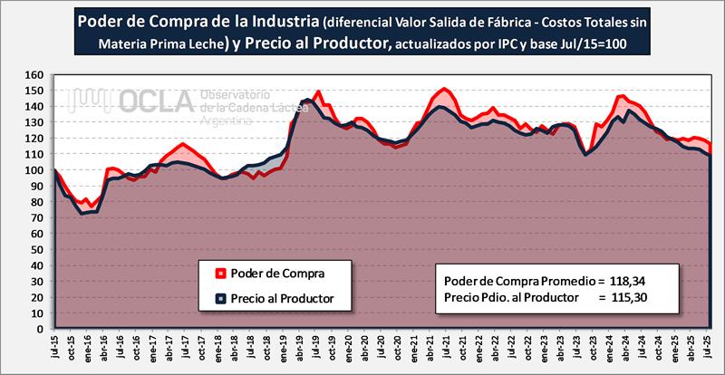 Viendo el precio real liquidado al productor y comparado con la capacidad de pago promedio de la industria, actualizada por IPC y llevado a base julio 2015 = 100, para un período más prolongado, puede observarse que en el largo plazo (salvo oscilaciones temporales) los valores promedio convergen: Indice 115,30 por litro de Precio al Productor e Indice 118,34 por litro de Poder de Compra, con un cierto distanciamiento en el período nov23-ago24 a favor de los poderes de compra, y equiparándose ambos índices entre sep24-feb25 y volviendo a ser superiores los poderes de compra en marzo-agosto próximos pasados.