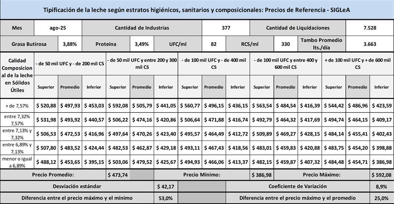 En el cuadro de tipificación, la leche comercializada se divide en 25 estratos según composición y calidad higiénico-sanitaria y, dentro de cada estrato, se muestra un promedio ponderado del precio del total de esos litros y además un promedio ponderado del 20% superior e inferior de los precios.
