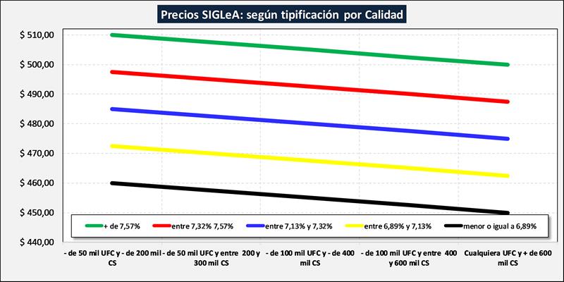 En el gráfico de arriba se presentan en 5 curvas por Tipo de leche en función a los sólidos útiles (grasa butirosa + proteína), los diferentes precios en función a la calidad higiénico-sanitaria (UFC/ml y RCS/ml). Se puede observar que existen precios descendentes en cada tipo composicional a medida que desmejora la calidad higiénico-sanitaria, pero se dan algunos serruchos ya que las “penalizaciones” por menor calidad se ven compensadas seguramente por la presencia de bonificaciones comerciales que pueden estar especificadas y tabuladas (ejemplo: volumen, temperatura, distancia, permanencia, etc.) o arbitrarias en función a aspectos no especificados en los Sistemas de Tipificación y Pago de la Leche (netamente comerciales).