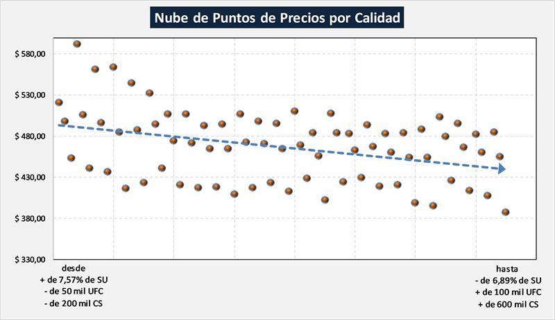 Si elaboramos una nube de puntos con los diferentes precios disponibles en función a las calidades, podemos observar que se da una pendiente descendente de precios a medida que es menor la calidad integral de la leche, pero esa pendiente podría ser mucho más pronunciada si se pretende mejorar/incentivar la mejor calidad de leche.