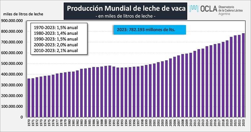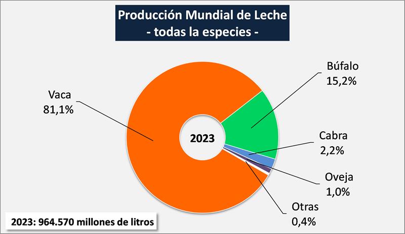 A nivel mundial, la producción de leche de vaca aumentó un 2,0% hasta los 782 millones de toneladas, mientras que la producción de leche de búfala creció un 2,8% hasta los 147 millones de toneladas.