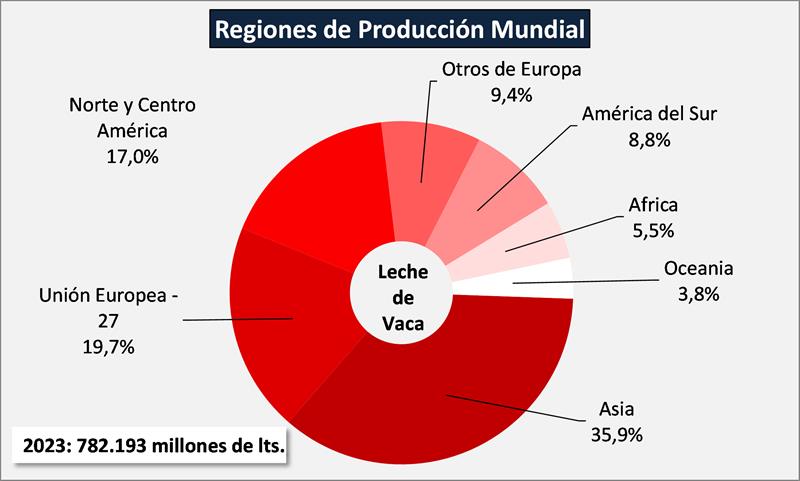 La producción mundial de leche de vaca, que representa una gran parte del stock mundial de leche (81% en 2023), aumentó en casi 16 millones de toneladas en 2023 (+2,0%), alcanzando los 782 millones de toneladas. La tasa de crecimiento coincidió con la tasa de crecimiento promedio durante el período de 2015 a 2023 (+2,0%). La gran mayoría de este crecimiento de la oferta provino de Asia (13 millones de toneladas, lo que representa el 85% del aumento total), donde la demanda de leche y productos lácteos ha sido más pronunciada en los últimos años.