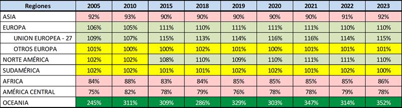 Determina la situación de autosuficiencia para el abastecimiento doméstico y los excedentes con destino a exportación de las diferentes regiones mundiales.
