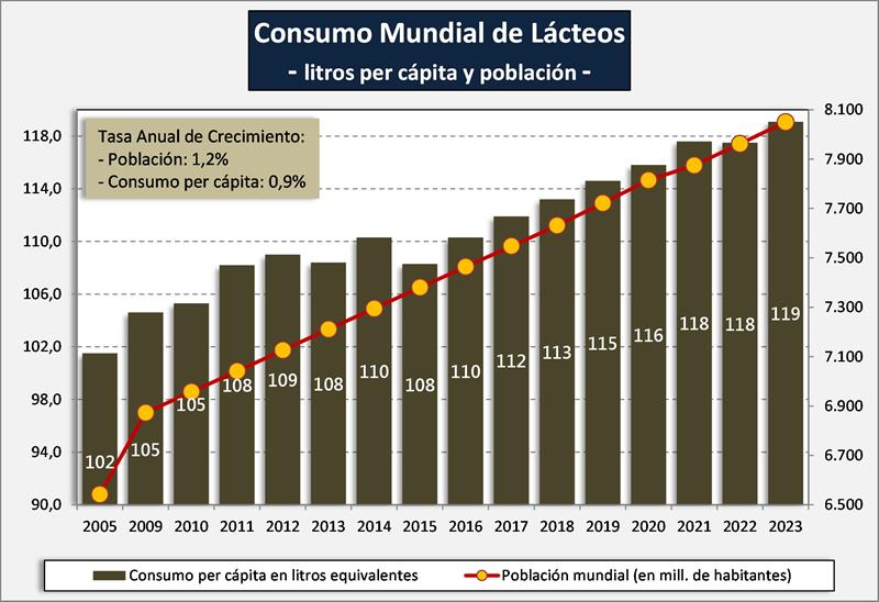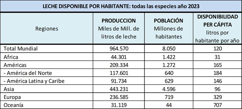 El consumo mundial de leche per cápita presenta un promedio bastante por debajo de la recomendación FAO-OMS (500 mililitros diarios, unos 180 litros por año). Hay países de Europa con consumos que superan los 300 litros por persona y por año y países por debajo de los 50 litros. Los países desarrollados en promedio consumen 240 litros y los países en desarrollo 80 litros por persona y por año.