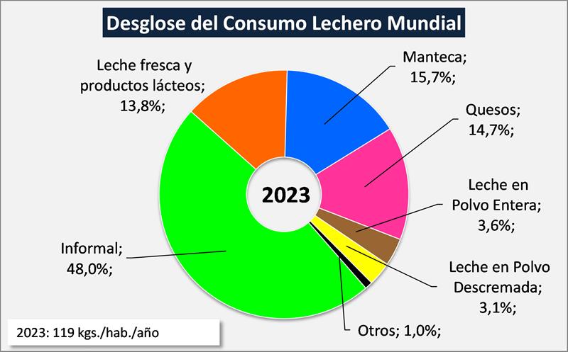 A escala mundial, la producción de leche de vaca aumentó más rápidamente que las entregas de leche, con tasas de crecimiento respectivas del 2,0% y el 0,7% en 2023. Con este aumento en las entregas de leche, la producción total de productos lácteos repuntó en comparación con 2022 y con la tendencia a largo plazo para casi todas las categorías de productos. En general, los procesadores favorecieron el queso (+2,2%) y la mantequilla y el aceite de mantequilla (+2,4%), ambos en línea con la CAGR de 2015 a 2023. La producción de WMP aumentó un 1,8% y otros productos mostraron un crecimiento más modesto (leche condensada +1,4%, leche líquida a +0,9% y leche desnatada en polvo a +0,4%) o disminuyó (productos de suero a -2,2%). En 2023, el consumo per cápita mundial aumentó a 119,1 kg (+1,6 kg) después de estabilizarse en 2022. Si bien la población aumentó en 70 millones de personas a 8.100 millones, el consumo mundial creció un 2,0%. Asia siguió siendo la principal región consumidora, representando el 50% del consumo total, con un consumo per cápita anual que alcanzó los 102 kg. El consumo aparente de leche disminuyó en la UE 27 y aumentó en los EE. UU.