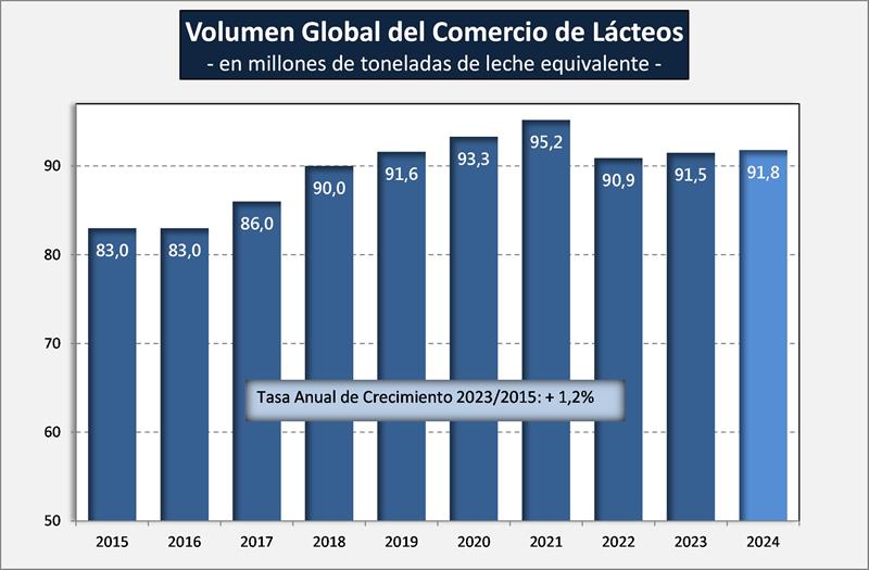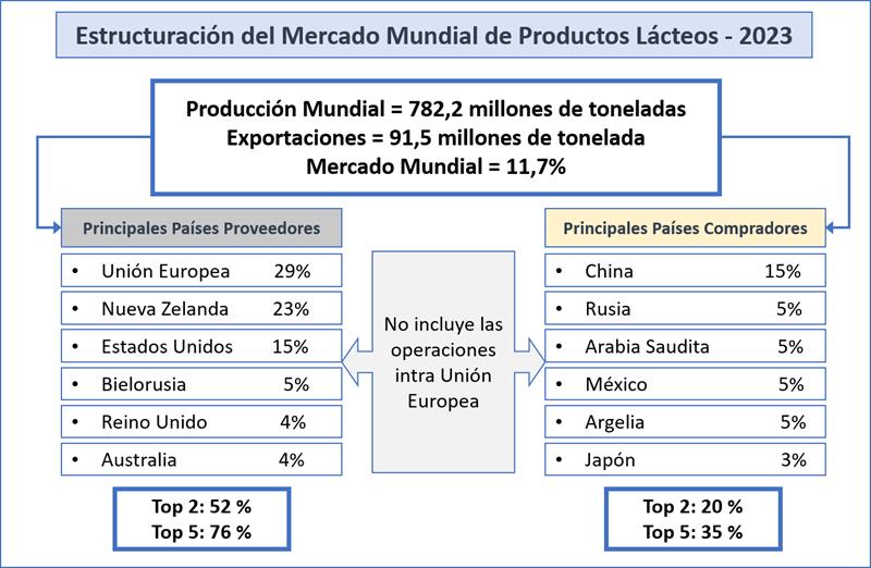 A pesar de tener la producción mundial de leche un volumen significativo, el comercio mundial de dicho producto es relativamente bajo en términos porcentuales. Se encuentra muy concentrada la oferta en pocos países/bloques y hay una cierta atomización en la demanda, situación que lejos de corregirse se bien ampliando. Ese volumen pequeño, sumado a la alta relación que tiene con algunas variables de la economía mundial (precio del petróleo, valor del dólar, comportamiento del PBI, inflación, empleo, etc.), le dan al mercado lácteo mundial su propia característica de alta volatilidad y gran incertidumbre para todos los actores de la cadena de valor.