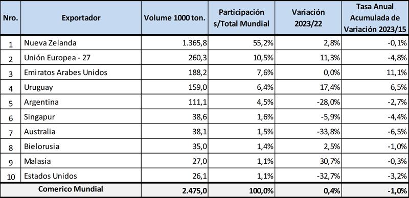 Las importaciones chinas disminuyeron debido al exceso de oferta. La UE 27 mantuvo su condición de mayor exportador mundial de productos lácteos, con una participación del 29% y dominando las exportaciones de queso, leche y nata, seguida de Nueva Zelanda (23%), que lideró las exportaciones de leche entera en polvo y mantequilla y aceite de mantequilla.