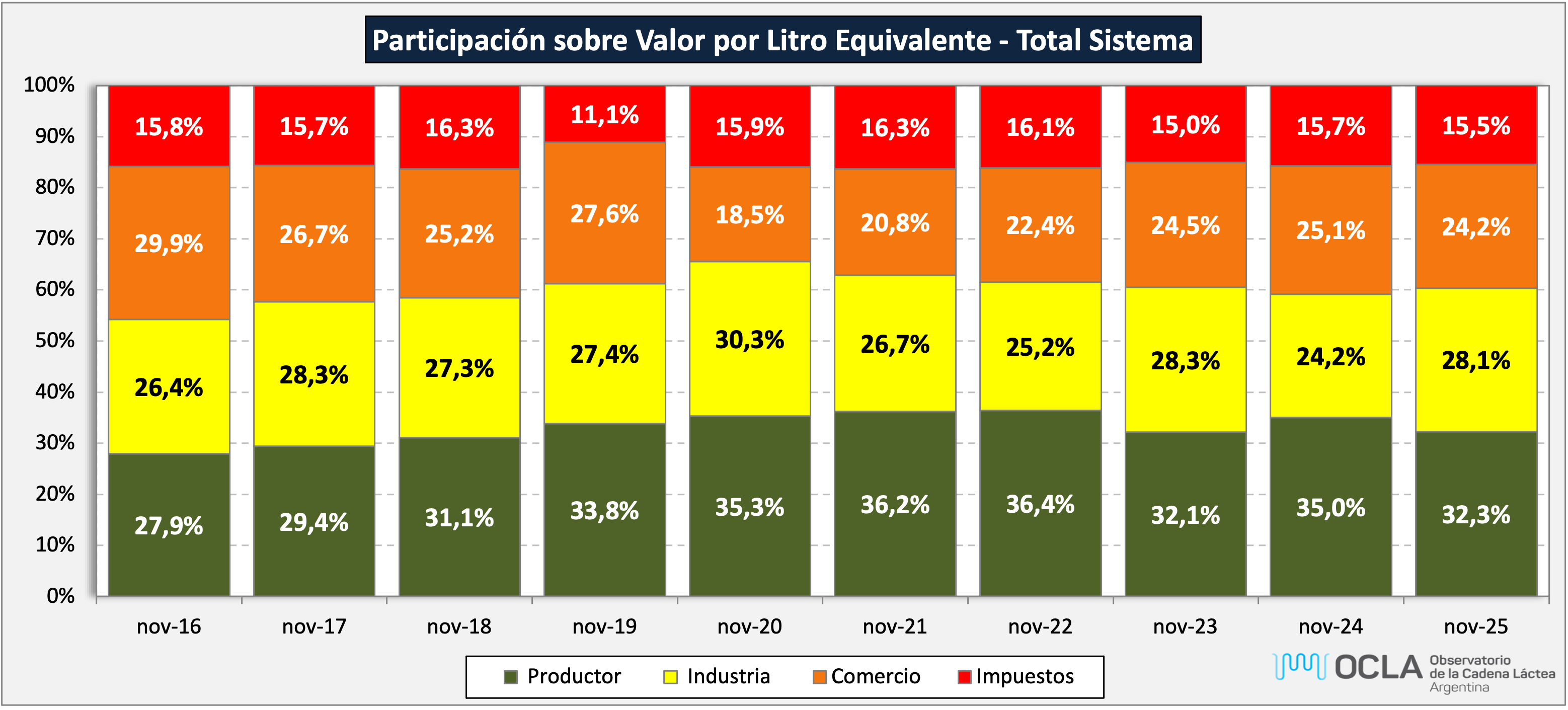 muestra el agregado de valor en cada etapa de la cadena en términos de porcentajes de participación respecto al precio final al consumidor.
