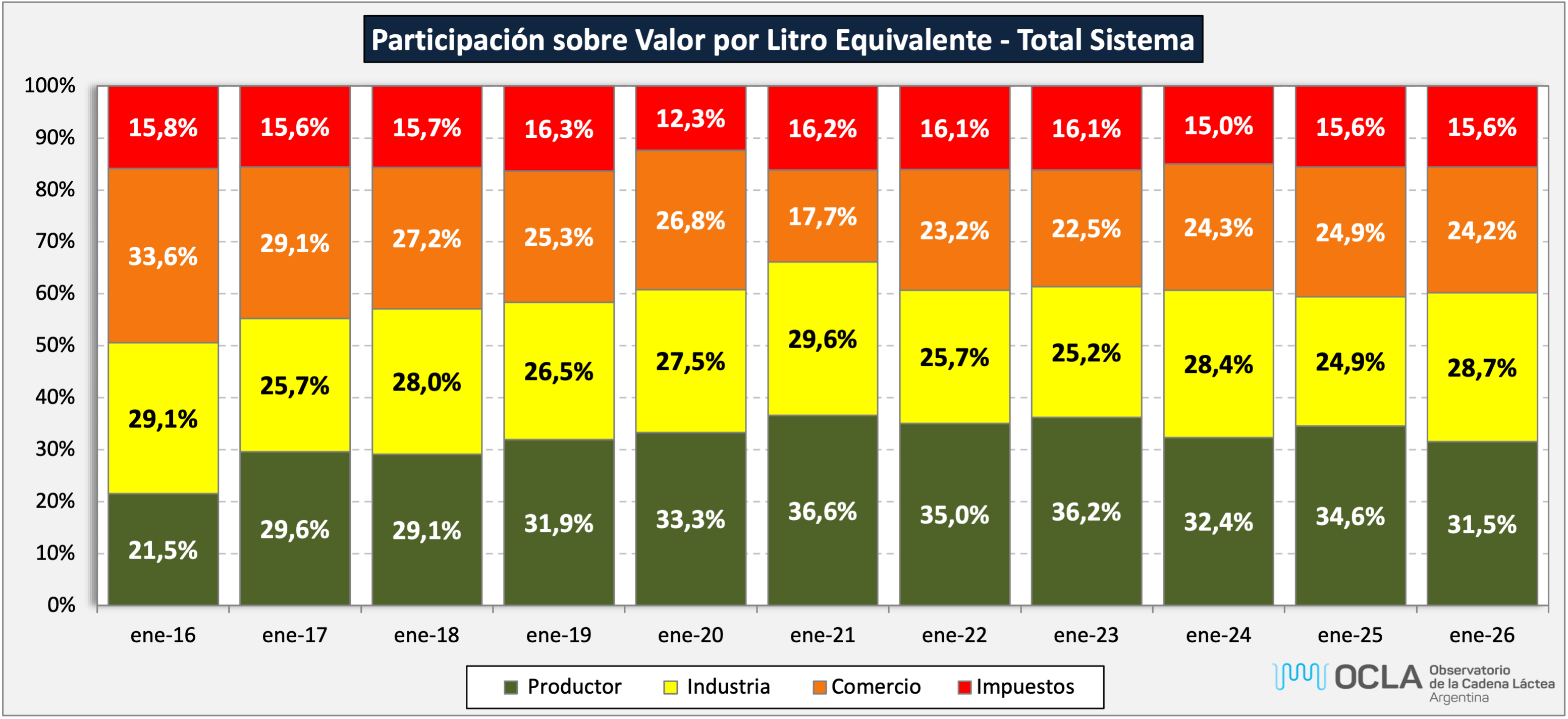 A partir de la idea de que el precio que paga un comprador expresa -de algún modo- el “valor” reconocido del bien que adquiere; el concepto de “valor por litro equivalente” (VLE) pretende exteriorizar el que le corresponde al “litro de leche cruda” en las diferentes etapas que lo convierten en un bien final de consumo. Las instancias en las que se practican las mediciones de precios son: Tranquera de productor, Planchada de industria, Consumidor final sin impuestos al consumo, Consumidor final (con impuestos al consumo). Dado que, excepto el que corresponde al de “tranquera productor”, los precios están referidos a unidades de productos diversos (quesos, leches fluidas, polvo, dulce, yogures, etc.) pero no en “litros de leche cruda”, el “VLE” traduce dichos precios en términos de los litros de leche empleados en su elaboración. La referencia “Total Sistema”, que se incluye en la información suministrada, refiere a la ponderación empleada para unificar los “VLE” de los diferentes productos en una única expresión que los contenga. La misma se realiza sobre la base del “mix” estimado del destino del total de los litros producidos y procesados. :