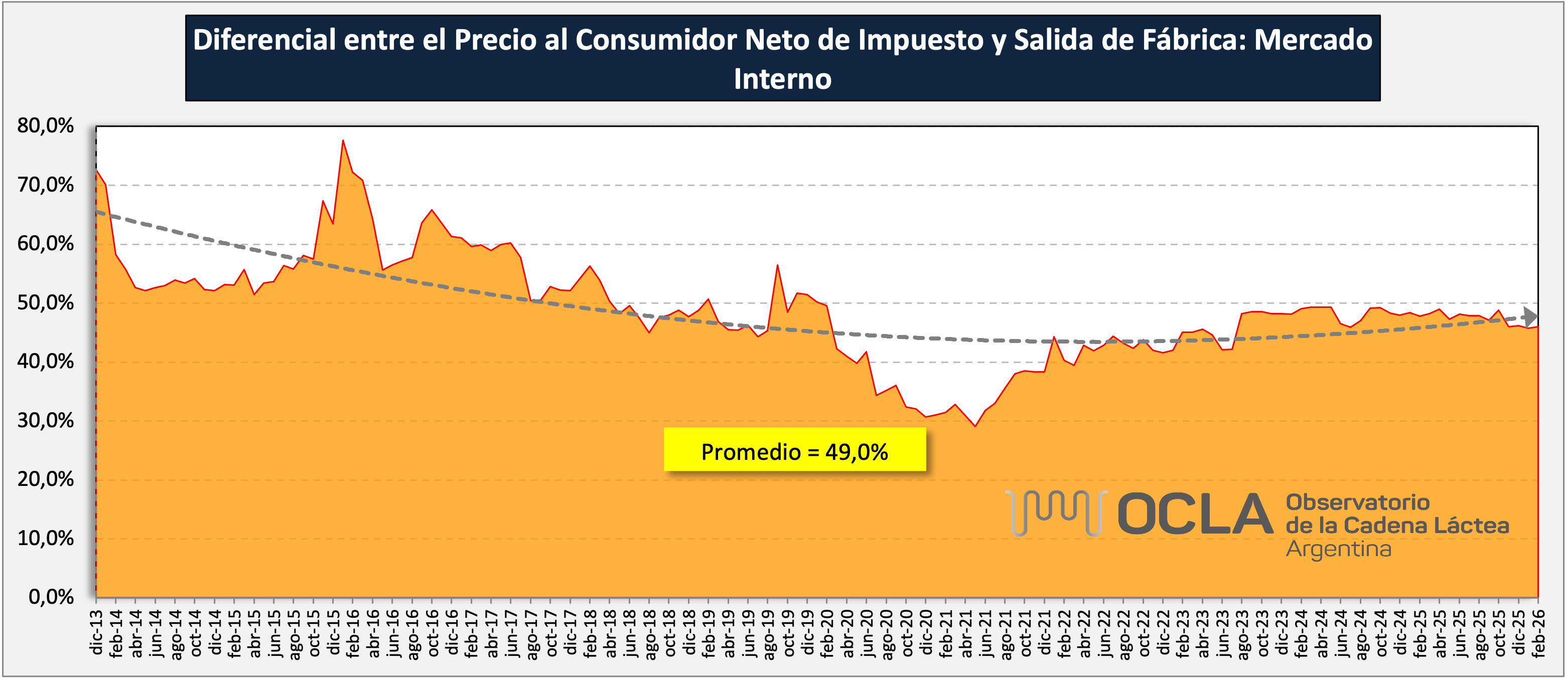representa el porcentaje de diferencia entre el valor de salida de fábrica de los productos y el valor al consumidor neto de impuestos. No representa el “margen comercial” ya que dentro de ese diferencial hay costos de distribución y de comercialización que normalmente son a cargo de la industria. Los costos de distribución ascienden a +/- un 20% de ese diferencial, con lo que al porcentaje que muestra el gráfico hay que deducirle entre 12 y 14 puntos para lograr un valor neto de lo que podríamos denominar mark up (margen) del sector comercial minorista de mercado interno.