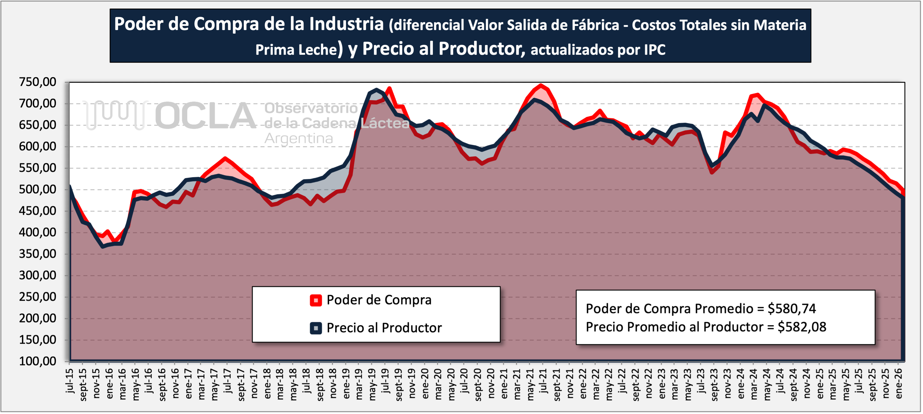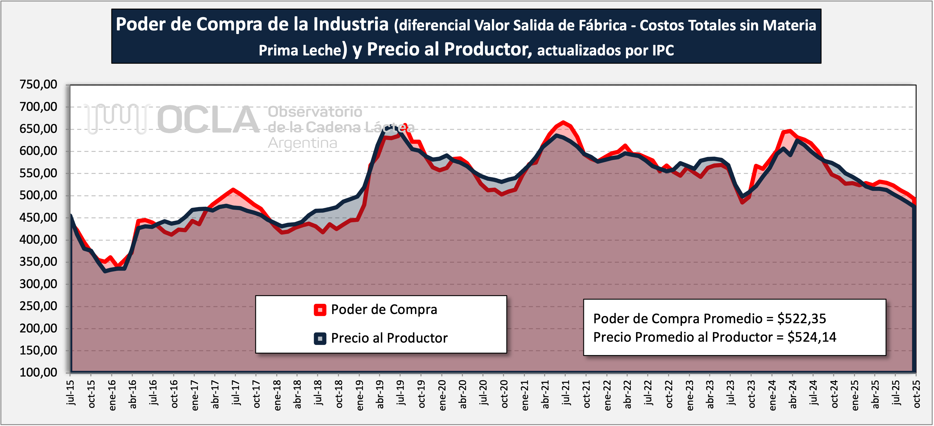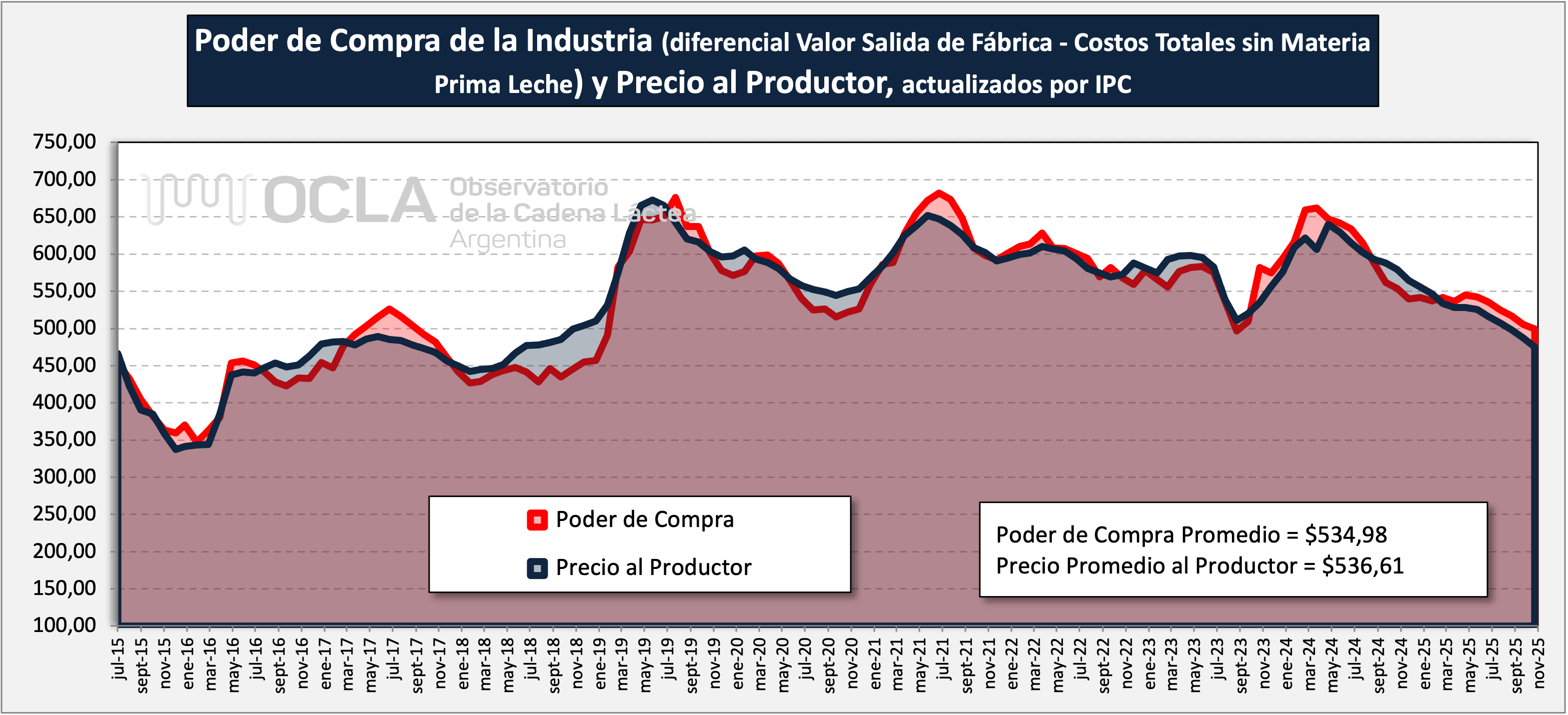 Poder de Compra = Valor de Salida de Fábrica – Costo Total de Producción Industrial sin Materia Prima Leche, expresa el precio por litro que podría pagar la industria por la materia prima leche en tranquera de tambo, en condiciones de equilibrio y con beneficio cero para la industria (sin beneficio extraordinario por encima del costo de oportunidad al capital invertido).