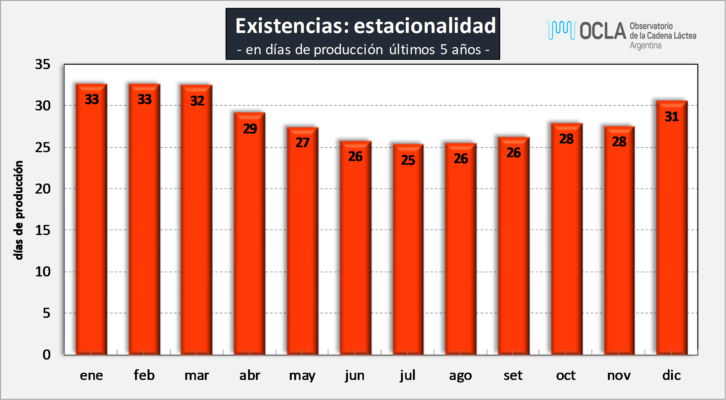 Días de producción: consiste en dividir las existencias en litros equivalentes del mes por la producción promedio diaria del mismo mes.