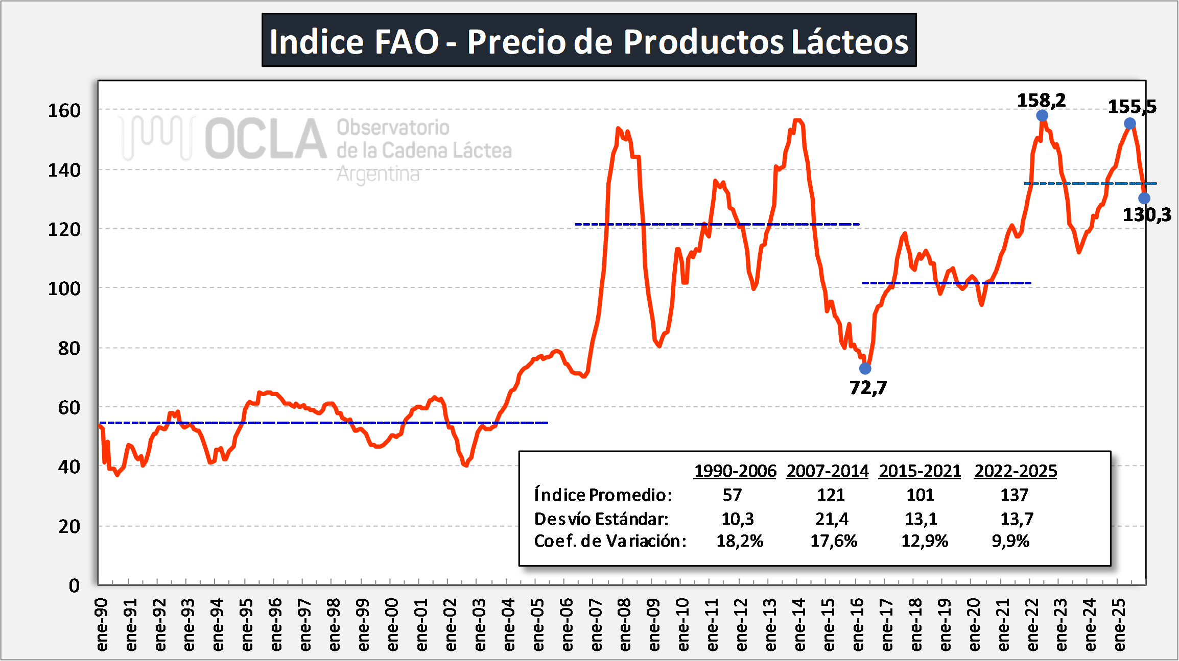 Indice de precios de los productos lácteos: se calcula sobre la base de los precios de la manteca, la leche descremada en polvo, la leche entera en polvo y el queso. La media se pondera por las cuotas medias de exportación de los últimos años.