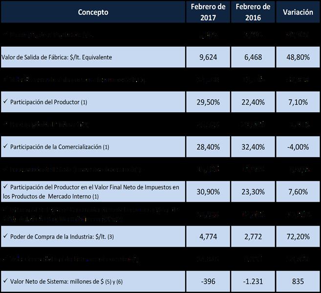 (1)      La variación se toma como el diferencial (resta) entre un valor y otro y no como variación porcentual como en los otros casos. (2)      Este valor no representa el margen comercial ya que dentro del mismo se encuentran costos de distribución y logística que normalmente están a cargo del sector industrial. (3)      Valor de Salida de Fábrica, menos el Costo Total de Producción Industrial sin Materia Prima Leche. Representa el precio que podría pagar la industria por la leche en tranquera de tambo, en condiciones de equilibrio y con beneficio cero por encima del costo de oportunidad al capital invertido. (4)      Total de la producción mensual de Argentina, multiplicada por el valor promedio final generado por la cadena en ambos mercados (consumo interno y exportación). (5)      Valor Generado menos Función de Distribución (comercialización), Valor Aplicado por la Industria y Valor Aplicado por el Sector Primario. Representa el resultado económico de toda la cadena de valor. (6)      Variación en términos absolutos, representa la mejora económica en los resultados.