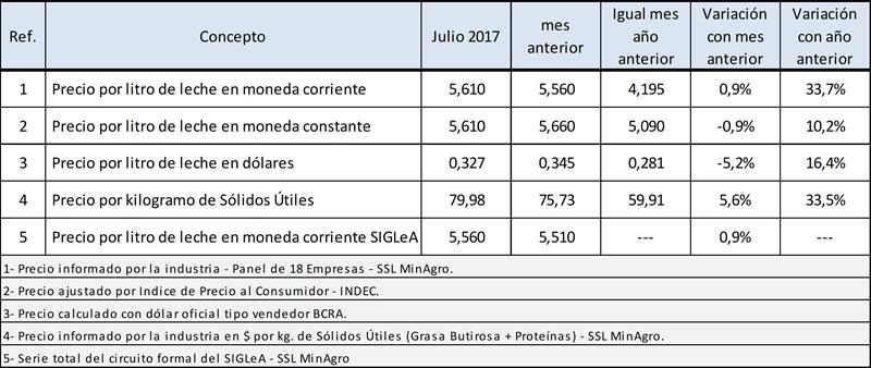Precios al Productor: julio de 2017 11/8/2017Precios al Productor para el mes de Julio de 2017 ![]() Precios por litro y por Provincia Serie total del Circuito Formal - todas las compras de leche cruda realizadas a través de la Liquidación Única Mensual Electrónica (LUME) ![]() elaborado por el OCLA en base a datos de la SSL - MinAgro