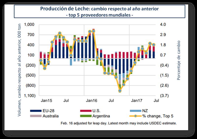 Evolución de la producción de leche de vaca en los principales países productores: la información surge de USA (USDA), UE28 (Eurostat), NZ (DCANZ), Australia (Dairy Australia) y Argentina (SSL-MinAgro). El acumulado de estos 5 países en el período enero-julio 2017 presentaría un crecimiento del 0,5% respecto a igual período del año anterior.