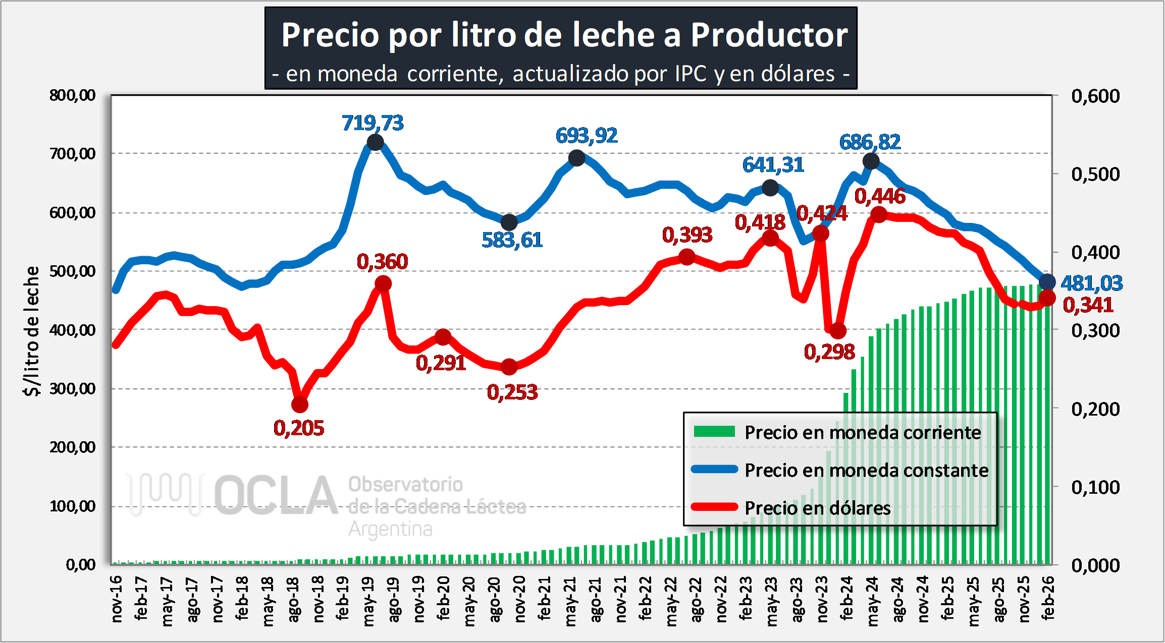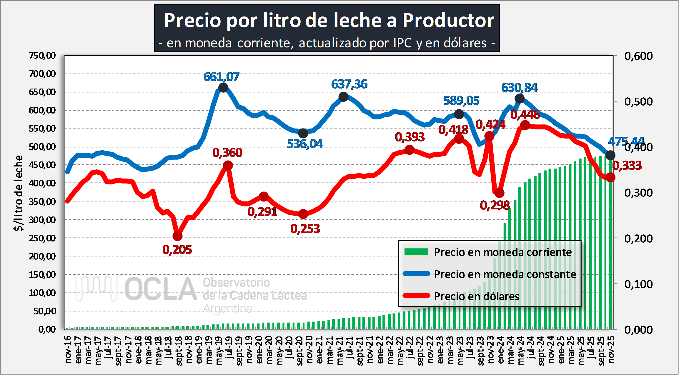 Precio al Productor: en monedad corriente, constante y en dólares por litro