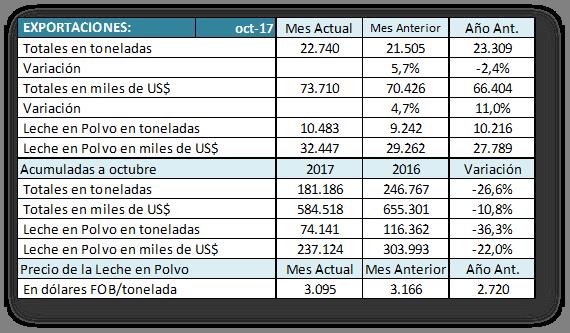 Exportaciones de lácteos: a octubre 2017 28/11/2017