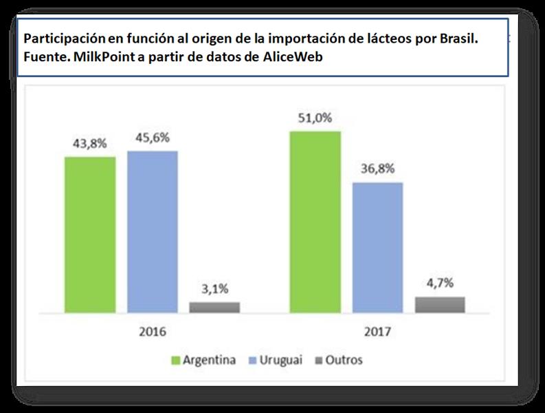 En cuanto al origen de la leche importada, Argentina retomó el liderazgo entre los mayores proveedores brasileños, respondiendo por el 51% del volumen comprado por Brasil, aumento de 7,2% en relación a 2016. Mientras tanto, Uruguay tomó el camino opuesto, y disminuyó su participación en 8,8% en 2017, siendo responsable en 2017 por el 36,8% del volumen de compras lácteas brasileñas.