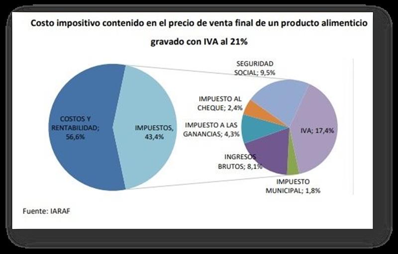 En los alimentos como los lácteos que tributan el 21% de IVA, el costo impositivo asciende a 43,4%, por lo que casi la mitad de lo que paga el consumidor por cada producto son impuestos.