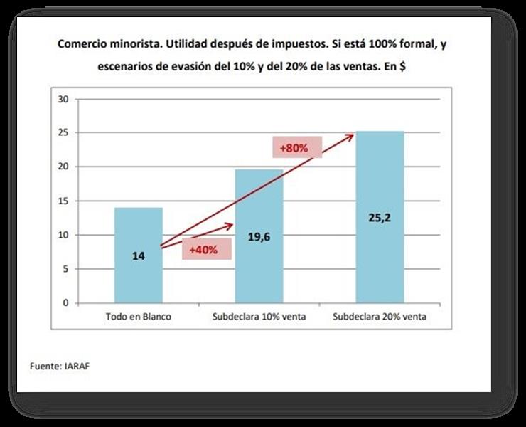 El alto nivel de carga tributaria genera, suponiendo el resto de las variables constante, un elevado ingreso por evadir. Según calcula el informe de la consultora, la subdeclaración del 10% de las ventas incrementa las utilidades en un 40%; mientras que al del 20%, la eleva al 80%.