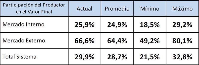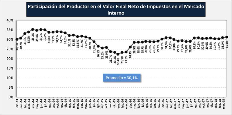 También puede observarse, en el gráfico siguiente, la mejor participación del productor en el precio final neto de impuestos a la venta en el mercado interno, que presenta un promedio en los últimos 5 años del 30,1% y para abril de 2018 fue del 31,0%.