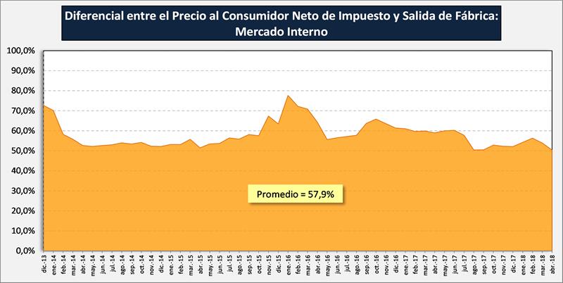 A pesar de esa situación adversa para el productor, puede observarse que la participación en el valor final de mercado fue de 29,9%, un 1,8% mejor que el año anterior. La industria mejoró su participación en 1,1%, con lo que ambos aumentaron en detrimento del sector comercial que cayó 2,8% de participación, que como puede observarse en el gráfico siguiente descendió en su mark up (margen bruto comercial: diferencial relativo entre el valor al consumidor neto de impuestos al consumo y el valor de salida de fábrica), que presenta en los últimos años un valor promedio del 57,9%, habiendo registrado su valor máximo en enero de 2016 con el 77,6% y su nivel más bajo, precisamente en abril de 2018 con el 50,4%.