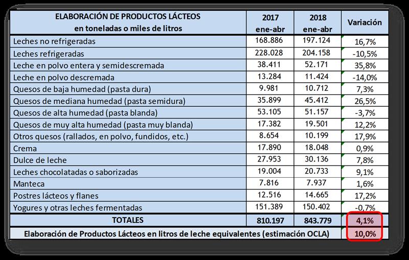 Los cuadros son elaborados por el OCLA en base a información de la Dirección Nacional Láctea - MinAgro en función del panel de industrias lácteas establecido a partir del relevamiento coyuntural de la Resolución 230/16 e información histórica de la Resolución 7/14, ambas de la SAGyP. Los valores se expresan en toneladas y miles de litros, dependiendo del tipo de producto y la conversión a litros de leche equivalente se realiza con los coeficientes disponibles en OCLA.