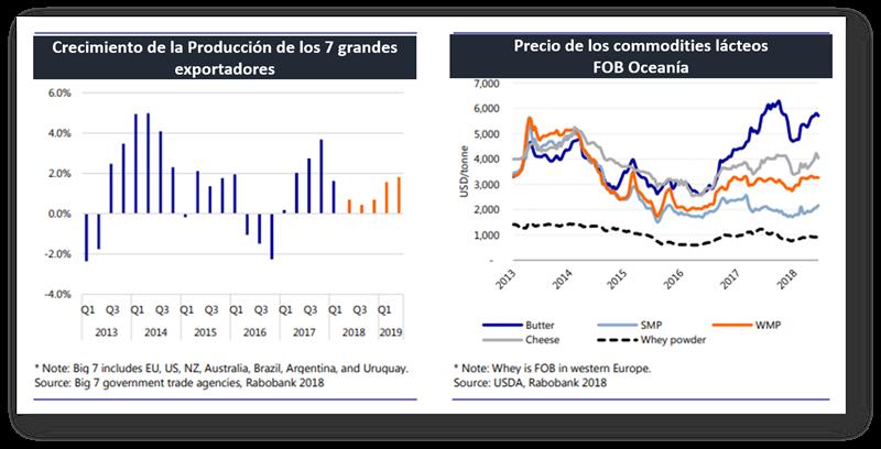 El suministro mundial de leche en las principales regiones exportadoras se espera que crezca, aunque a un ritmo muy modesto, un 0,4% en el  3° trimestre de  2018. No es sorprendente que con el crecimiento interanual, el excedente exportable neto de estos 7 grandes, se verá limitado en el 2° semestre de 2018, antes de ganar algo de impulso en el 1° trimestre de 2019.