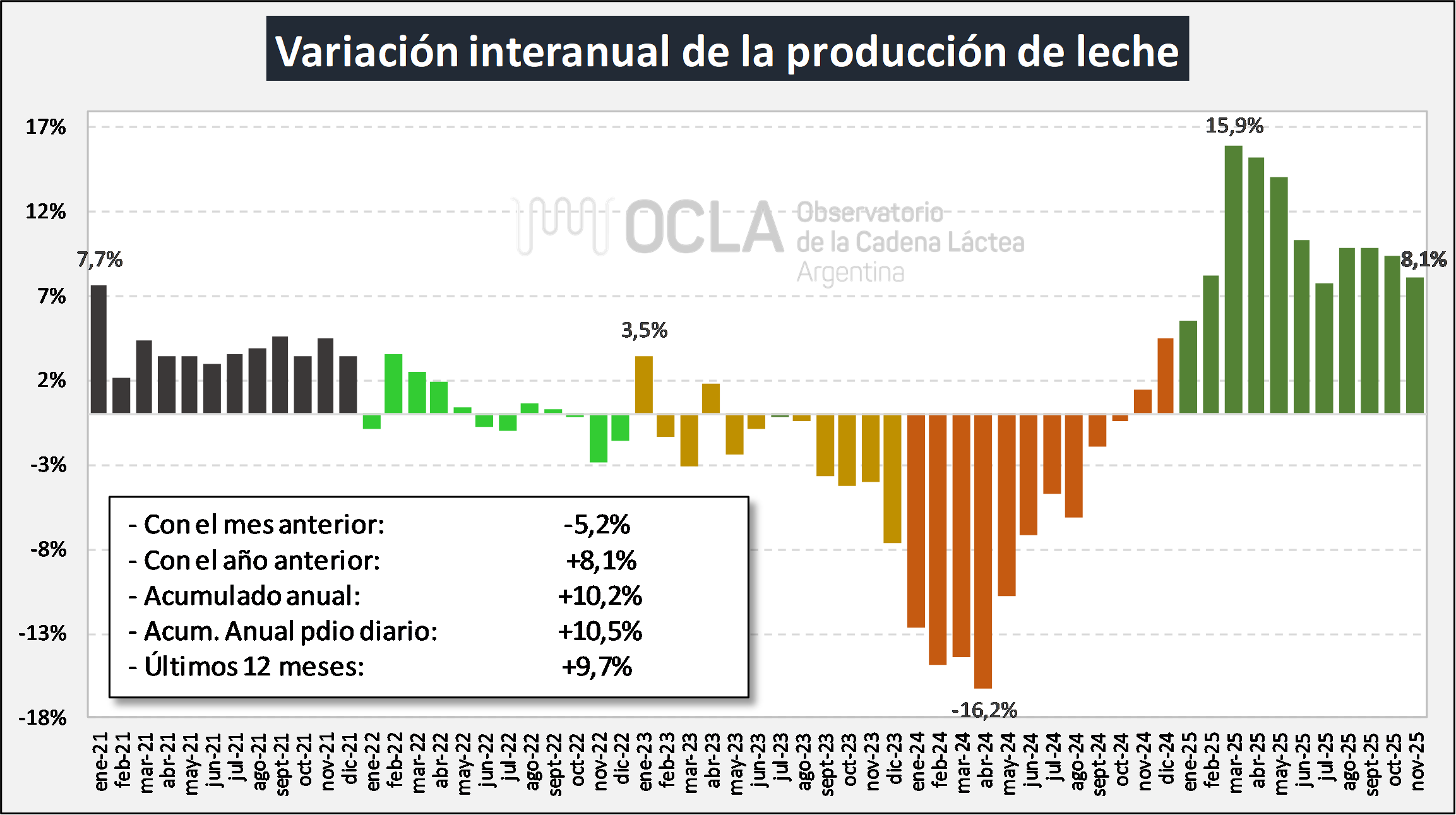 Producción nacional de leche cruda: se obtiene mensualmente agregando 9 bloques de datos primarios y/o calculados, representativos de distintos subsectores a nivel de industria o a nivel país: leche formal, leche decomisada, leche informal, tambos de terceros, tambos propios, pooles de leche, masa para muzzarella, provincias extra cuencas y leche no industrializada.