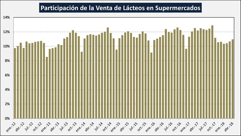 Evolución de la participación de los lácteos en la venta de los supermercados