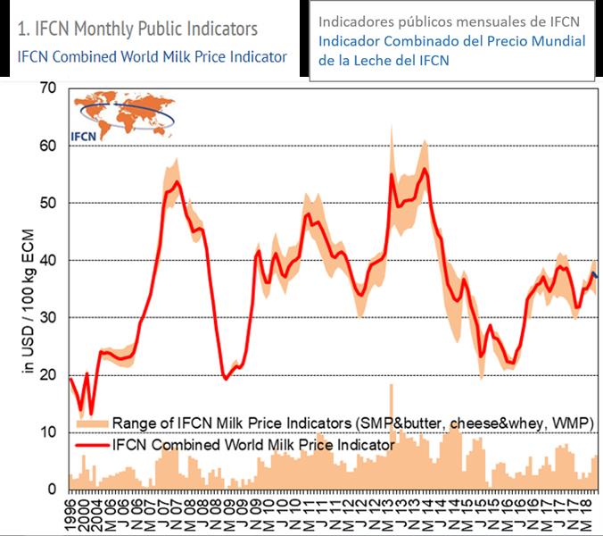 El Indicador combinado IFCN del Precio Mundial de la Leche ilustra el nivel de precios de leche en el mercado mundial. Representa el valor teórico que un procesador podría pagar a sus remitentes, comercializando sus productos en el mercado mundial y operando con costos industriales estándar.