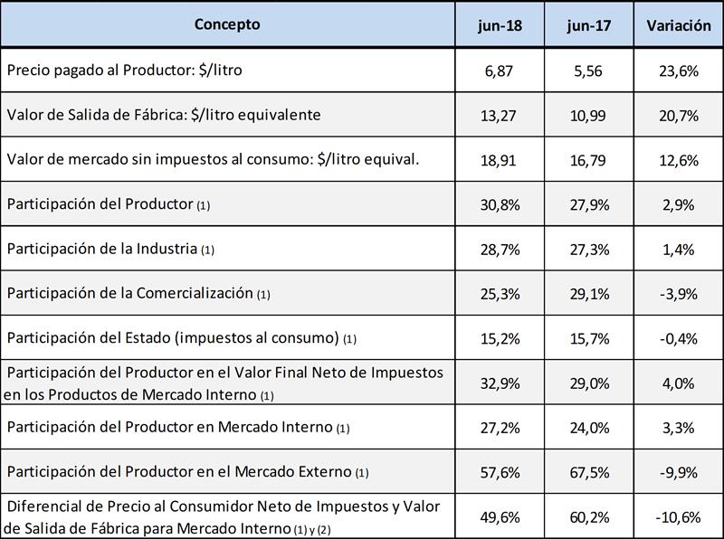 El valor para el mercado interno, muestran un retraso del 15,7% respecto a junio del año pasado cuando se los ajusta por IPC y del 28,4% cuando se los mide en dólares. El Valor Neto de la Cadena como venimos mencionando en informes anteriores presenta cifras negativas (aún no tenemos los valores a junio 2018), sobre todo en el sector primario, y aunque hay mejoras en la participación en el precio del productor estas son insuficientes para cubrir el costo total promedio ($ 6,88/litro) y el precio estimado de equilibrio ($ 7,92/litro), con un precio de $ 6,87/litro.