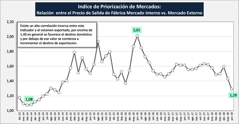 Ya en mayo próximo pasado el indicador de priorización de mercados, se acercaba a 1,40 que es donde comienza a resultar más atractivo el mercado externo que el doméstico y que se evidenció en un incremento interanual del 43,6% en volumen y 31,4% en valor en las exportaciones.
