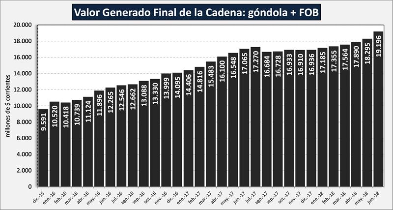 La facturación de la cadena láctea en su conjunto para el mes de junio de 2018, como lo muestra el gráfico de arriba, fue de $ 19.196 millones lo que implica un crecimiento respecto al mes anterior del 4,9% y del 12,5% respecto a igual mes del año anterior.