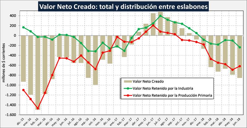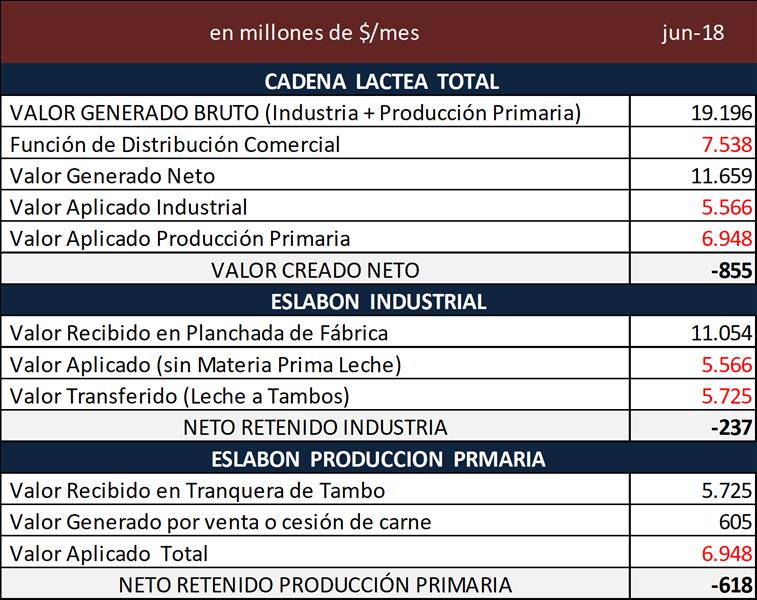 El resultado obtenido fue de $ 855 millones negativos, con una pérdida para el sector primario de $ 618 millones ($ 1,03/litro) y de $ 237 millones para el sector industrial, que incrementa su nivel de pérdida respecto al mes anterior (para mayo fue de $ 100 millones), como lo indica el cuadro de la Cadena de Valor.