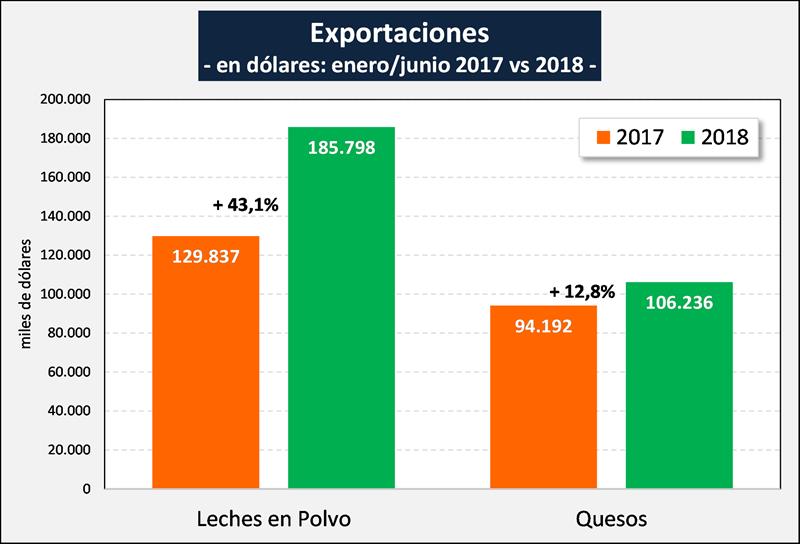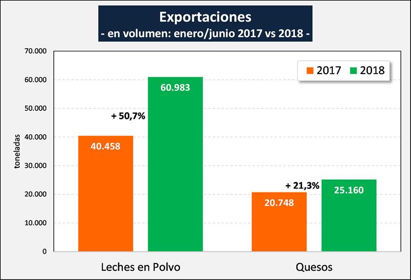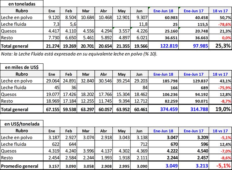 Según lo que hemos obtenido del Sistema de Consulta de Comercio Exterior de la página de INDEC, las exportaciones en volumen para el período enero-junio de 2018 respecto a igual período de 2017 han crecido en un 25,3% y en valor un 19,0%. Respecto a los valores promedios obtenidos por tonelada, han disminuido en un 5,1% en dólares y se incrementaron el 28,8% si se lo mide en pesos.