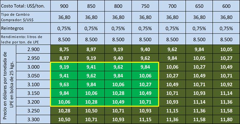 El cuadro de doble entrada tiene por un lado los valores de costos de elaboración y comercialización, el tipo de cambio, el reintegro de impuestos y la conversión de litros de leche a kilogramos de producto. Por otro lado el valor que se puede conseguir para la leche entera en polvo en bolsas de 25 kgs., en dólares por tonelada.
