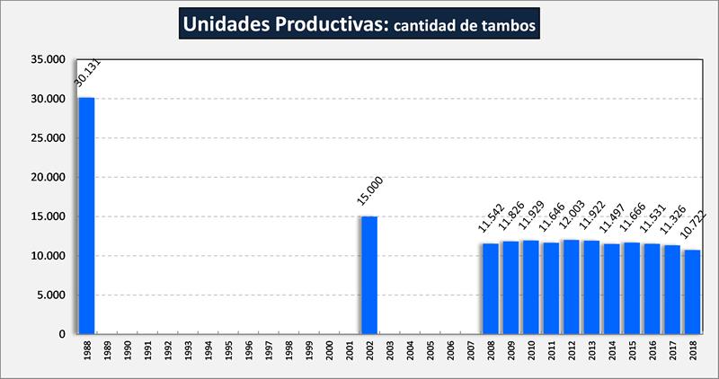 Observaciones: los datos históricos son a marzo de cada año, los datos de 2018 corresponde a agosto de 2018. Al 05/09/18 las cifras alcanzan a 10.731 unidades productivas (8 tambos más que el mes anterior) y 1.584.962 vacas. En rigor estadístico las tasas de reducción de tambos y vacas serían para un período de 17 meses, con lo que la corrección a 12 meses, llevaría dichas tasa a -3,7% y -5,0%.