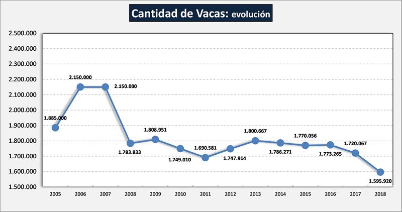 El gráfico siguiente presenta la evolución del número de vacas que registra SENASA, 1.595.920 cabezas para 2018 lo que representa un -7,2% respecto al dato disponible del año anterior. Salvo para el período 2006-2007 y 2012-2013 el número de cabezas siempre fue en descenso (1,3% anual en los últimos 13 años).