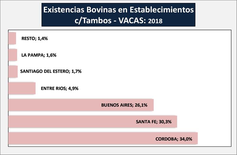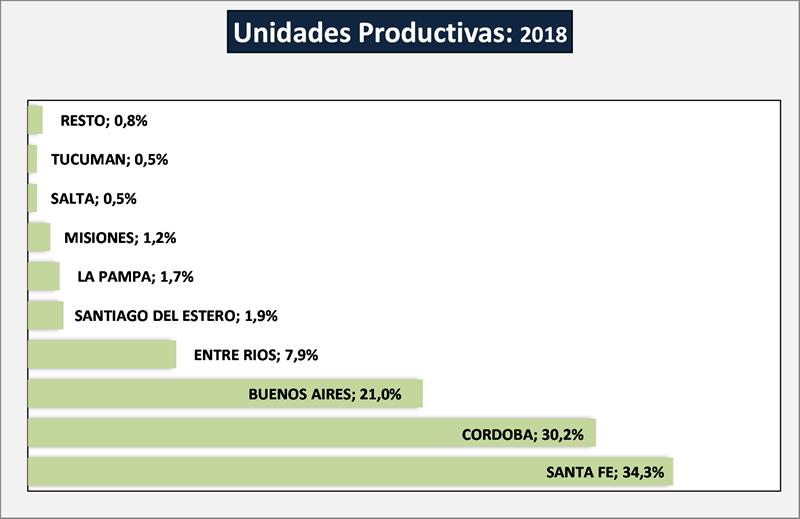 Por su estructura productiva, Santa Fe presenta la mayor cantidad de tambos (3680 = 34,3%) pero Córdoba lo supera en producción debido a que cuenta con tambos de un mayor tamaño tanto en número de vacas como en producción individual.
