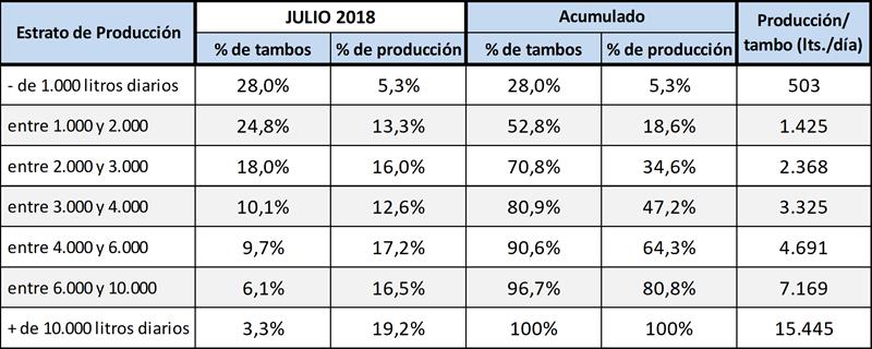 Puede observarse que los tambos de menos de 2.000 litros diarios de leche que representan el 52,8% de las unidades productivas, aportan el 18,6% de la leche total, y en el otro extremo los tambos de más de 10.000 litros diarios, que son sólo el 3,3% del total, aportan un volumen mayor de leche, el 19,2%. Los 360 tambos más grandes que producen un promedio de 15.445 litros diarios en promedio, aportan la misma cantidad de leche que los 5.800 tambos más pequeños que producen en promedio, menos de 2.500 litros de leche por día.
